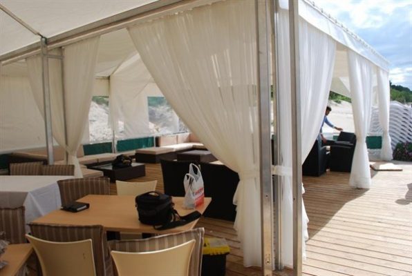 Chị Quỳnh nói rằng vào mỗi buổi sáng sớm khi ánh nắng lên. Thì toàn bộ không gian nội thất trong nhà hàng bằng gỗ đều phải sử dụng bạt vải để che lại. Vì buổi sáng đây là lúc nhân viên bắt đầu dọn dẹp và chuẩn bị thức ăn chữ chưa có khách. Mặc dù vậy những chị vẫn muốn bảo vệ hệ thống nội thất, chúng đều là những nội thất đắt tiền. Yếu tố sử dụng bền lâu và sang trọng nên chị không hề muốn chúng bị nứt nẻ và phai màu. Nên chúng tôi quyết định khuyên chị nên sử dụng hệ thống bạt che nắng, mưa cho trước cửa nhà hàng.